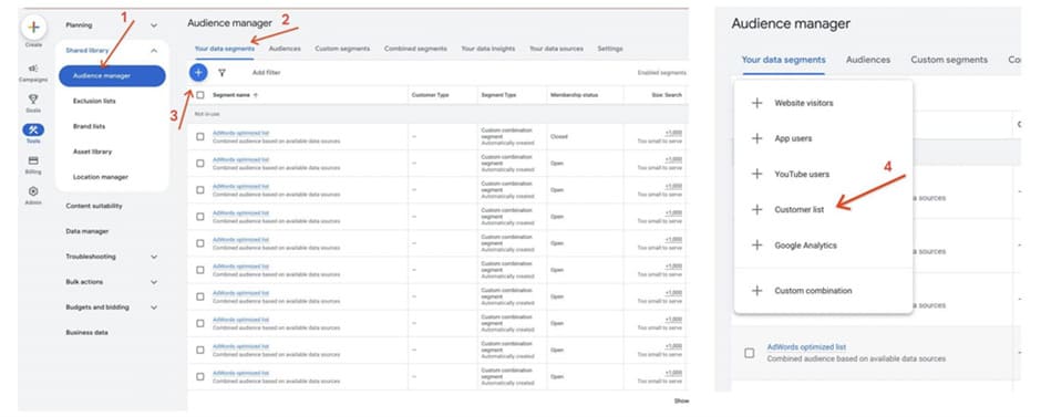 - creating segments through Customer Match in Google Ads or similar features in Meta Ads;
