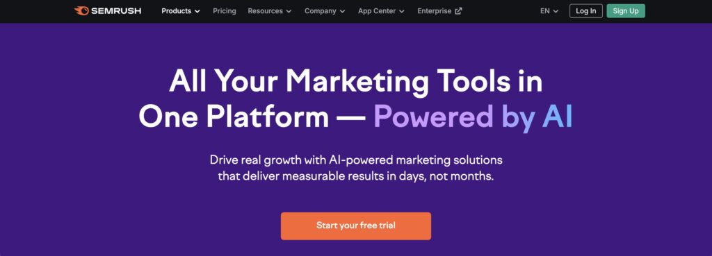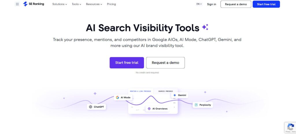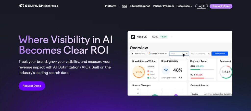 An all-in-one SEO solution equipped with AI features for search analysis, rival analysis, and AI search rank. The platform monitors the brand’s reputation through large-language-model (LLM) powered search results and spots AI-citation trends.