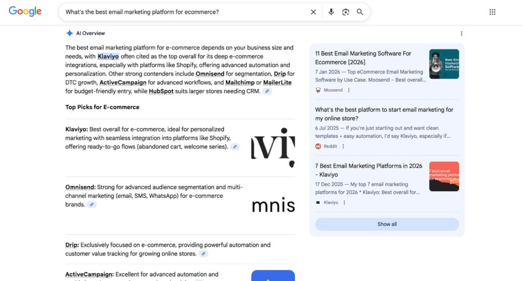 SEO tools like ChatGPT and Gemini generate information about your software right in their interfaces. When someone asks, “What’s the best email marketing platform for ecommerce?” they frequently receive a detailed response without ever visiting the website.